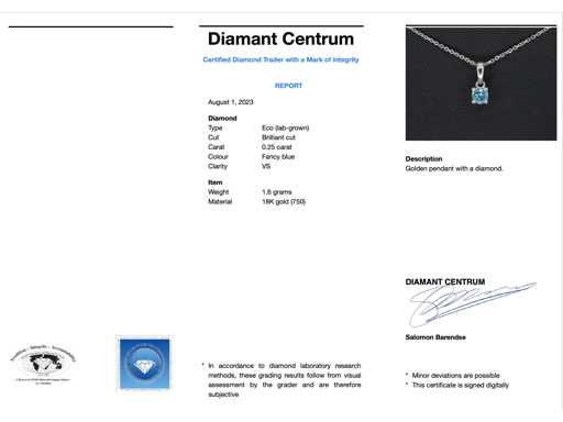 Diamant: Eco (lab-grown); Aantal: 1 stuk; Slijpvorm: Briljant geslepen; Gewicht (carat): 0.25 carat; Kleur: Fancy baby blauw; Zuiverheid: VS; Certificaat: IGI; Juweel: Halsketting; Gewicht: 1.6 gram; Afmetingen/lengte: 45.5 cm; Materiaal: 18K goud (750); Conditie: Nieuw; Verpakking: Luxe sieradendoos; Toelichting: De kwaliteit is overgenomen van het rapport behorend bij item. De waardebepaling is een beoordeling van een gecertificeerde diamantair, gebaseerd op consumentenprijzen.; Consumentenprijs: € 3.750,-
