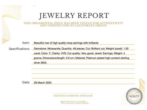 Edelsteen: Moissaniet; Aantal: 48 stuks; Slijpvorm: Briljant geslepen; Gewicht (carat): 1.50 carat; Kleur: F; Zuiverheid: VVS; Slijpkwaliteit: Zeer mooi; Juweel: Oorbellen; Merk: Harmony; Gewicht: 4 gram; Afmetingen/lengte: 0.9 cm; Materiaal: Geplatineerd hoog gehalte sterling zilver (925); Conditie: Nieuw; Verpakking: Sieradendoos of fluwelen etui; Extra informatie: Het gemeten gewicht van de edelstenen is volgens diamant maten; Consumentenprijs: € 800,-