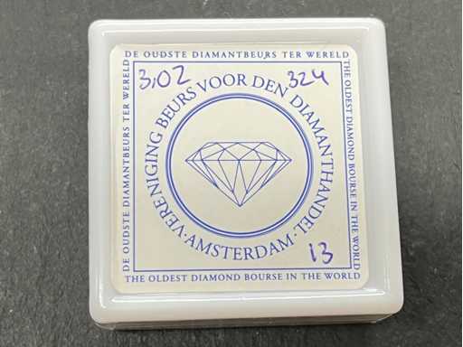 Diamant: Natuurlijk; Aantal: 13 stuks; Slijpvorm: Ruw; Gewicht (carat): 3.02 carat; Kleur: Mixed; Conditie: Nieuw; Verpakking: Edelsteendoos; Toelichting: De kwaliteit is overgenomen van het rapport behorend bij item. De waardebepaling is een beoordeling van een gecertificeerde diamantair, gebaseerd op consumentenprijzen.; Consumentenprijs: € 1.320,-