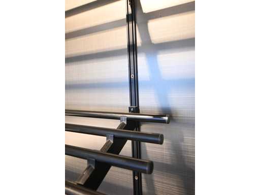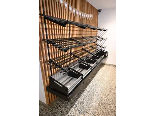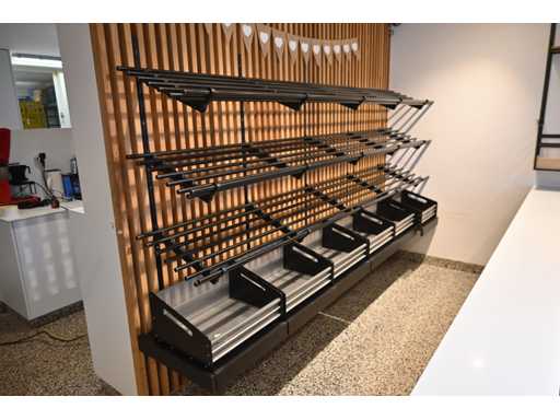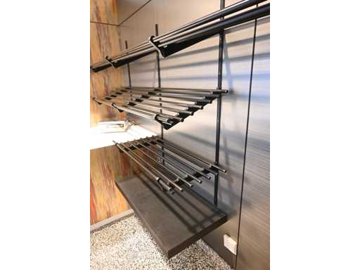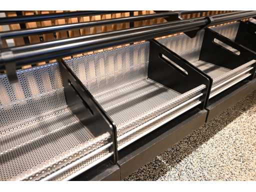 Inclusief ophangsysteem. Lengtes 3 x L300 x B50cm, 1 x L265 x B50cm, 1 x L185 x B50cm, 1 x L100 x B50cm en 1 x 6-Delig broodrek inclusief 6 broodmanden