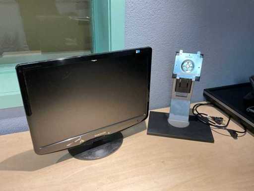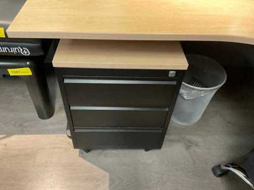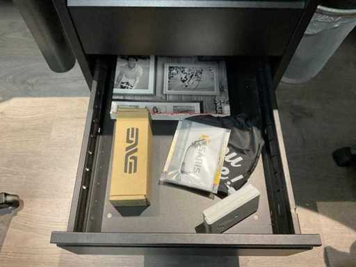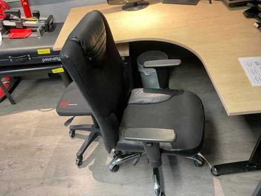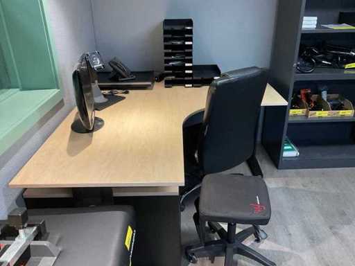 Bestaande uit: hoek bureau (180x160x75 cm), bureaustoel, krukje, ladenkast, 2x scherm, telefoon, bakjes, prullenbak.