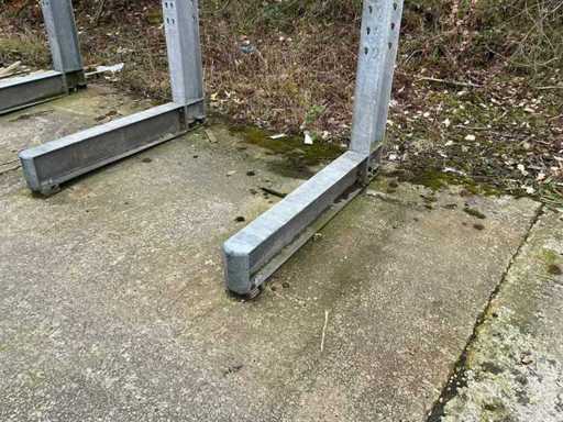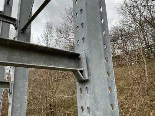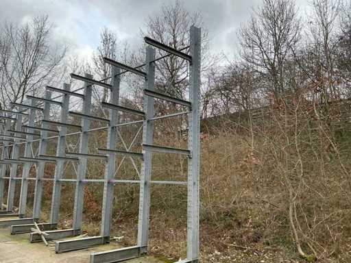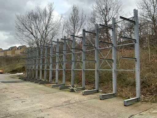 Dit kavel heeft 14 staanders en 42 armen; Reeds gedemonteerd; wordt gedemonteerd uitgeleverd; staander; armen in hoogte verstelbaar; kolomhoogte 5000mm; gegalvaniseerd; armlengte 1240mm; draaglast 1000kg per arm;