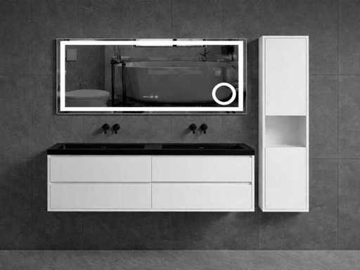 Hangkast 35x35x160cm. Hangkast kan zowel links als rechts naast het meubel gehangen worden, Let op: wordt geleverd met de mat zwarte bak (mat wit is niet meer beschikbaar), materiaal 5-laags multiplex(zeer sterk en vochtbestendig), kranen exclusief , Lades 4 stuks met softclose, wasbak van acryl, wordt geleverd met spiegel model iris met verwarming, klok en vergrootglas met ledverlichting rondom aan voorkant met 3 verstelbare kleuren led 3000/4500/6000k led-dioden (geel/blauw/wit licht) met de volgende opties: digitaal display, geïntegreerde vergrotingsspiegel van 10cm doorsnede met ledverlichting(vergroot 3x), digitale klok, digitale temperatuur aanduiding, 220volt stekker(plug and play), verwarming ter voorkoming van condens, 1.5mm kopervrij met explosion-proof laag met dezelfde functie als gehard glas, afvoeren exclusief, Conditie: Nieuw in doos, Bijzonderheden: 2 jaar garantie, wasbak is met en zonder kraangaten mogelijk, keuze graag ook aangeven op de afhaaldag), compleet met installatie materiaal, zeer hoge kwaliteit, Let op: er mag ook voor een andere spiegel gekozen worden indien gewenst
