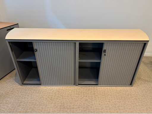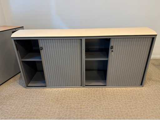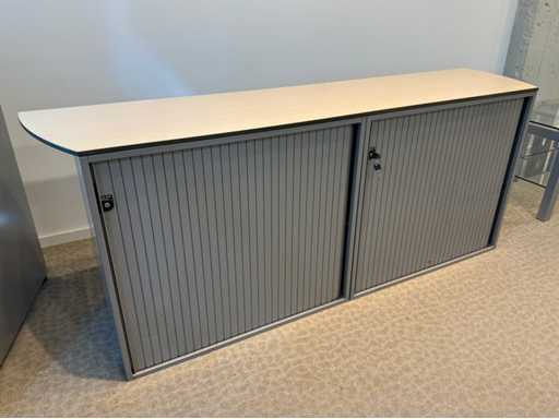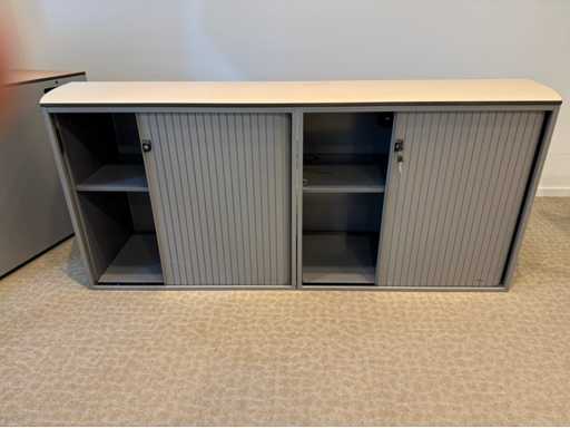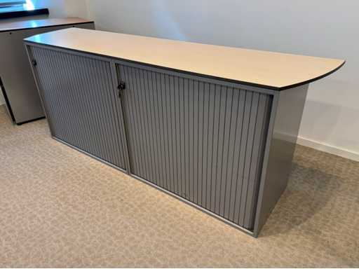 2 kasten voorzien van 1 gedeeld trespa houtnerf topblad en legbord, waarvan 1 voorzien van sleutel