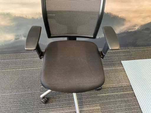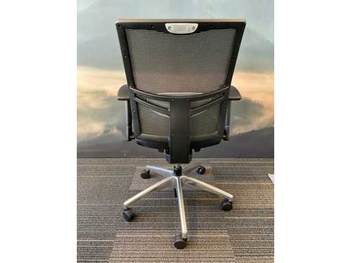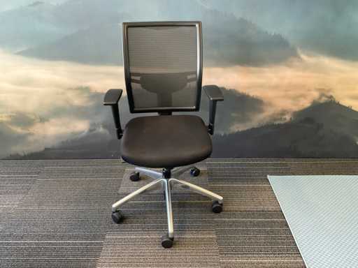 Voorzien van in hoogte verstelbare armleuningen, netweave rugleuning, zwart gestoffeerde zitting met lendesteun en stalen onderstel