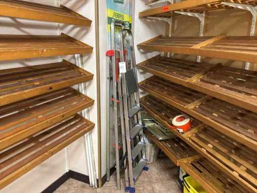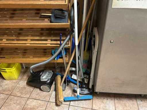 2 ladder, een keukentrapje, stofzuiger en verschillende bezems