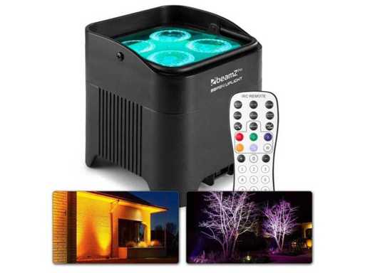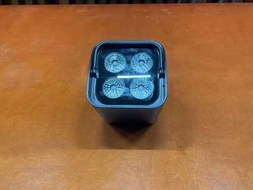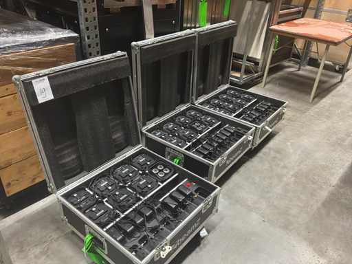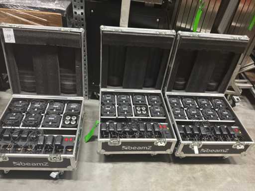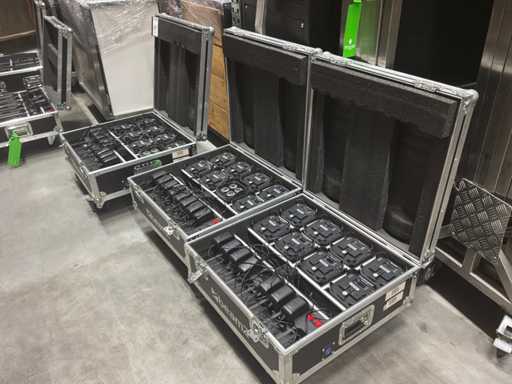 Oplaadbare RGBAW uplights. Verpakt in 3 flightcases