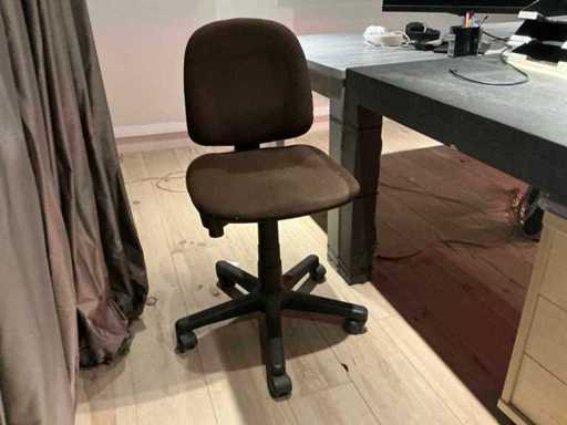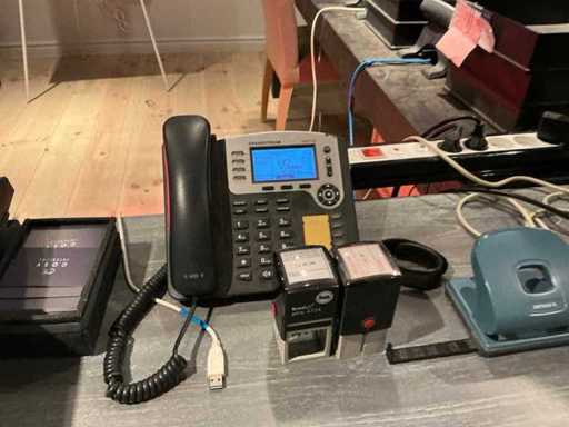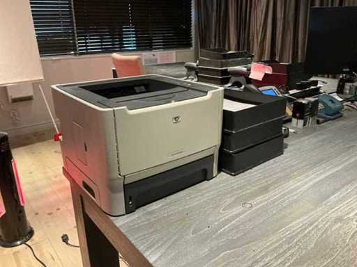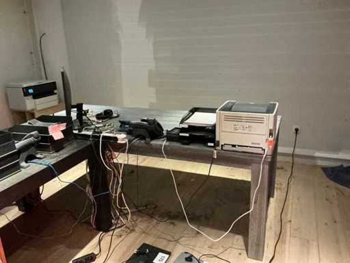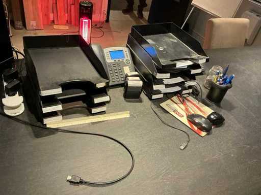 Waaronder afmeting circa 1x 220 x 98 x 78 cm en 1x 220 x 110 x 77 cm, 2x hoofdtelefoon, 2 diverse stoelen voorzien van stoffen bekleding en houten onderstel, bureaustoel, printer Hp, pvc legvakjes, 3x telefoontoestel, scherm Hp r4m1111, 2022, flipover, verrijdbare ladeblok en enig bureaumateriaal, uitgezonderd genummerde kavels afgifte volgens aanwijzing