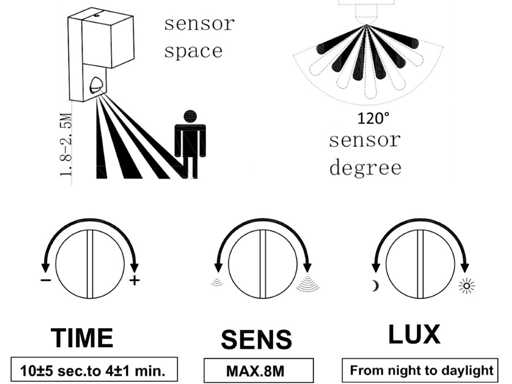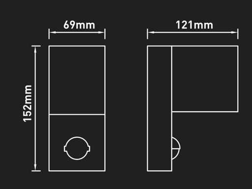 IP44 waterdicht, afm. 121 x 69 x 152 mm, materiaal aluminum en PC, met beweging sensor, verstelbare sensor gevoeligheid afstand 2m tot 8m, verstelbare verlichtingstijd 10 sec tot 4 min, verstelbare dag en nachtsensor, bevestiging inclusief, GU10 fitting, bulb niet inbegrepen, geschikt voor binnen en buiten, een bulb invoer, voltage 220-240V, max 35 watt, SKU 00885