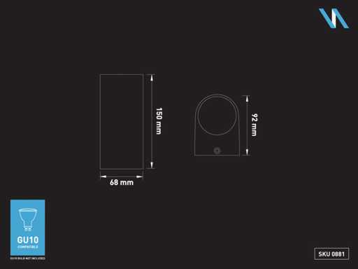 IP44 afdichting, afm. 92 x 68 x 150 mm, materiaal aluminum en glas diffuser, bevestiging inclusief, GU10 fitting, bulb niet inbegrepen, geschikt voor binnen en buiten, 2 x bulb invoer, voltage 220-240V, max 2 x 35 watt, SKU 00881