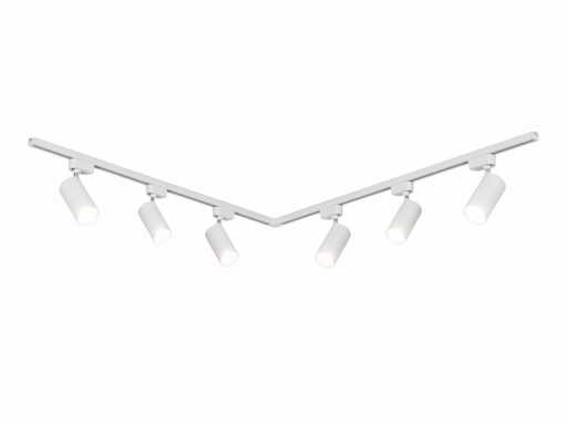 6 stuks 18 watt 4000K 1800 lumen LED Railspot cilinder zand wit afm. Ø 63 x 145mm, draaibaar 350° en kantelbaar 90° materiaal aluminum kop en PC basis, 2 stuks 100cm rail materiaal aluminium, Afdichting IP20, levensduur 30.000 uren, 1 stuk door verbinder en 1 stuk L verbinding inclusief, geschikt voor binnen, voltage 220-240V, SKU 1127 SKU 1085 SKU 1089