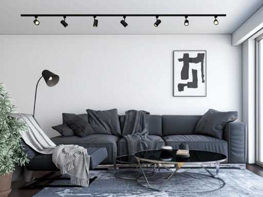 afdichting IP20, 1 stuk 100cm en 1 stuk 200cm rail, materiaal aluminium, bevestiging inclusief, 220-240V, 1 stuk door verbinder inclusief, product kleur zand zwart, 9 stuk railspots GU10 armatuur afm. Ø 55 x 102mm draaibaar 350° en kantelbaar 90° materiaal aluminum kop en kunstof basis, bulb niet inbegrepen, de rail kan eenvoudig op de gewenste lengte worden gezaagd, geschikt voor binnen, SKU 1088 SKU 1084 SKU 1086 SKU 1121