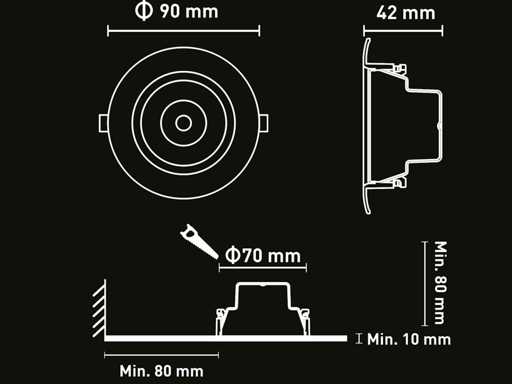 lichtstroom 425 lumen, afdichting IP54, lichtkleur 3 in 1 CCT switch warm wit neutraal wit en daglicht dat de kleurtemperatuur kan geschakeld worden tussen 3000K 4000K 6000K, stralingshoek 110°, product kleur wit, PS diffuser, vlamfertragend kunstof afm Ø 90 x 42 mm, inbouwdiameter ø 70mm, materiaal PC en kunstof, bevestigingsset niet inclusief, geschikt voor badkamer veranda balkon, levensduur 15.000 uren, voltage 220-240V, SKU 1161