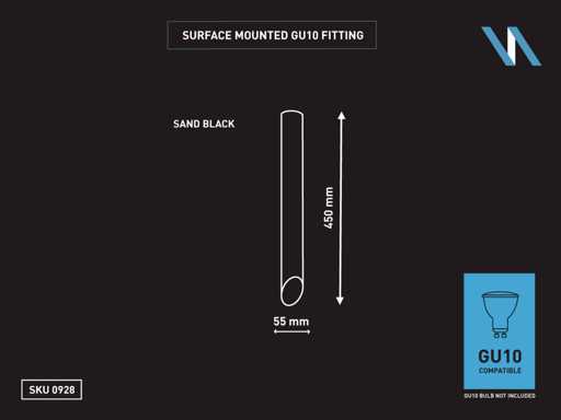 afdichting IP20, product kleur zand zwart, afm. Ø 55 x 450mm,bevestiging inclusief, materiaal aluminium, fitting GU10, bulb niet inbegrepen, geschikt voor binnen, een bulb invoer, voltage 220-240V, SKU 0928