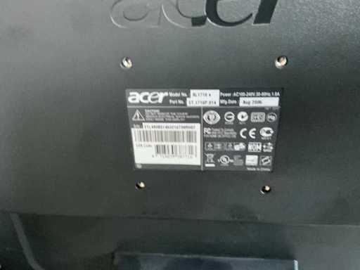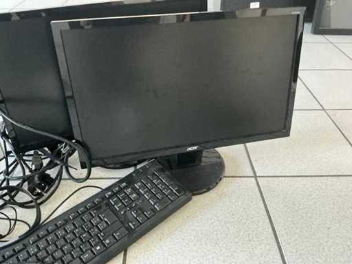 3 diverse computerschermen, acer compleet met toetsenbord en headset