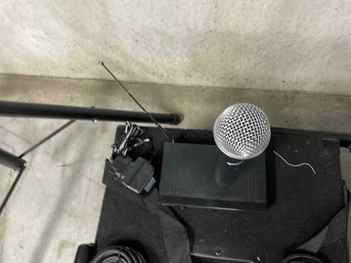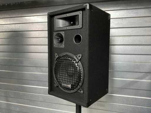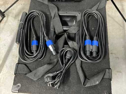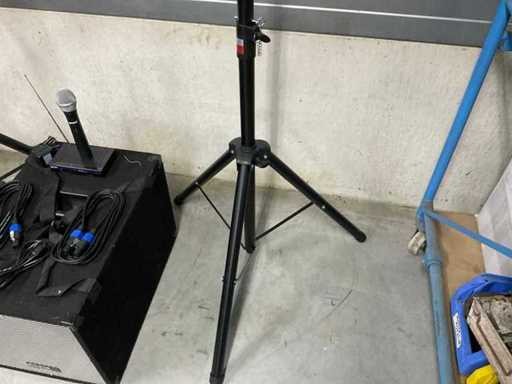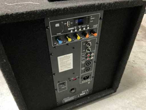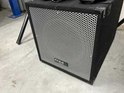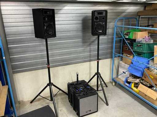 Bestaande uit: 12 inch Ibiza subwoofer (60x40x40 cm), 2x 8 inch speaker (24x27x46 cm) op statief, microphone, ontvanger, speakon kabels.