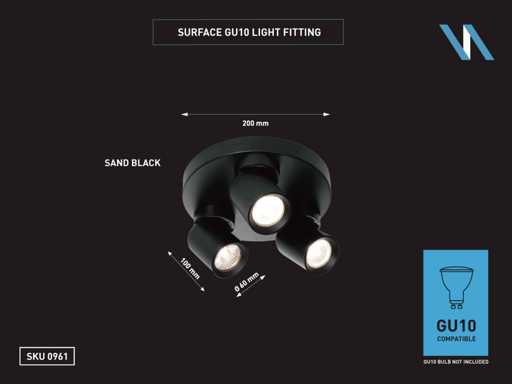 afdichting IP20, product kleur zand zwart, afm. Ø 60 x 100mm, afm wandhouder Ø 200 x 25mm, draaibaar 350° en kantelbaar 50°, materiaal aluminum en ijzer, bevestiging inclusief, fitting GU10, bulb niet inbegrepen, geschikt voor binnen, 3 x bulb invoer, voltage 220-240V, max 40 watt, SKU 00961