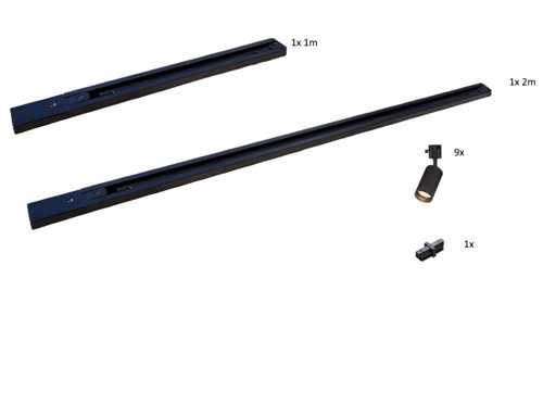 afdichting IP20, 1 stuk 100cm en 1 stuk 200cm rail , materiaal aluminium, bevestiging inclusief, 220-240V, 1 stuk door verbinder inclusief, product kleur zand zwart, 9 stuk railspots GU10 armatuur afm. Ø 55 x 102mm draaibaar 350° en kantelbaar 90° materiaal aluminum kop en kunstof basis, bulb niet inbegrepen, de rail kan eenvoudig op de gewenste lengte worden gezaagd, geschikt voor binnen, SKU 1088 SKU 1084 SKU 1086 SKU 1121