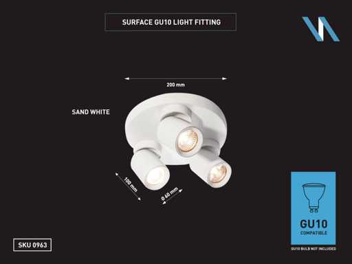 afdichting IP20, product kleur zand wit, afm. Ø 60 x 100mm, afm wandhouder Ø 200 x 25mm, draaibaar 350° en kantelbaar 50°, materiaal aluminum en ijzer, bevestiging inclusief, fitting GU10, bulb niet inbegrepen, geschikt voor binnen, 3 x bulb invoer, voltage 220-240V, max 40 watt, SKU 00963