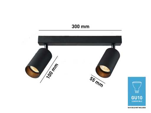 afdichting IP20, product kleur zand zwart, afm. Ø 55 x 100mm, afm wandhouder 300 x 50mm, draaibaar 350° en kantelbaar 90°, materiaal aluminum en ijzer, bevestiging inclusief, fitting GU10, bulb niet inbegrepen, geschikt voor binnen, 2 x bulb invoer, voltage 220-240V, max 35 watt, SKU 00846