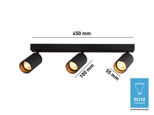 afdichting IP20, product kleur zand zwart, afm. Ø 55 x 100mm, afm wandhouder 450 x 50mm, draaibaar 350° en kantelbaar 90°, materiaal aluminum en ijzer, bevestiging inclusief, fitting GU10, bulb niet inbegrepen, geschikt voor binnen, 3 x bulb invoer, voltage 220-240V, max 35 watt, SKU 00848
