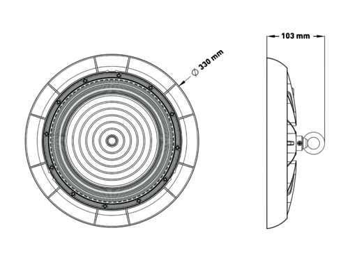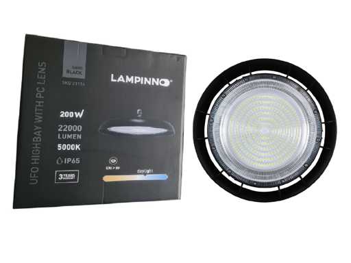 lichtstroom 22000 lumen SMD LED, lichtkleur daglicht 5000K, afdichting IP65, Lineaire IC driver inbegrepen, flicker free, stralingshoek 90°, product kleur zand zwart, diam Ø 330 x 103mm, materiaal aluminum en PC lens, met lens nauwkeurige lichtbundels zonder verspilling voor maximale helderheid, bescherming tegen mechanische inslagen IK07, bevestigingsset niet inclusief, levensduur 30000 uren, voltage 200-240V, sku 1116