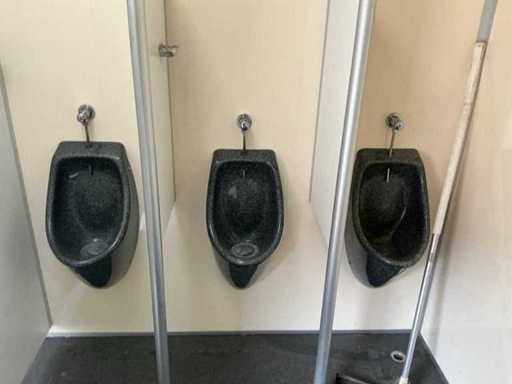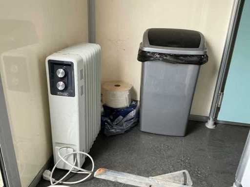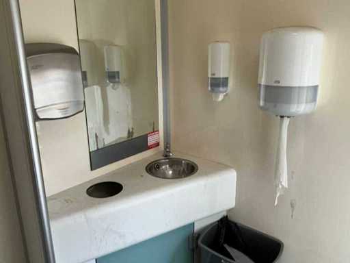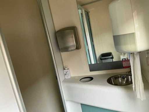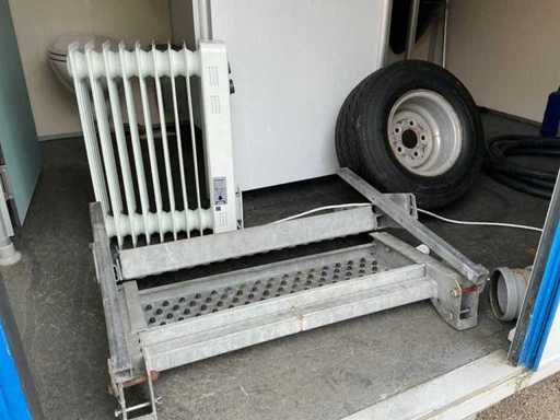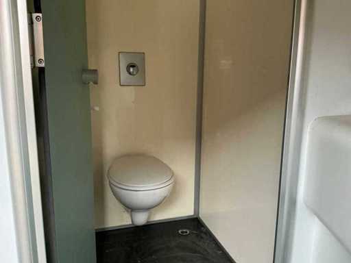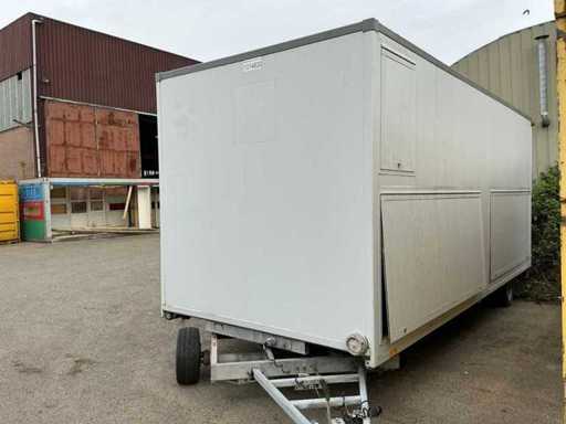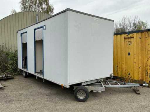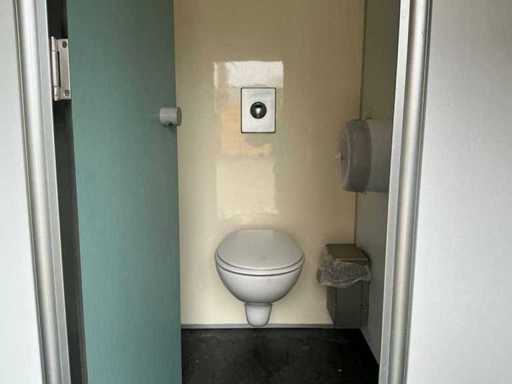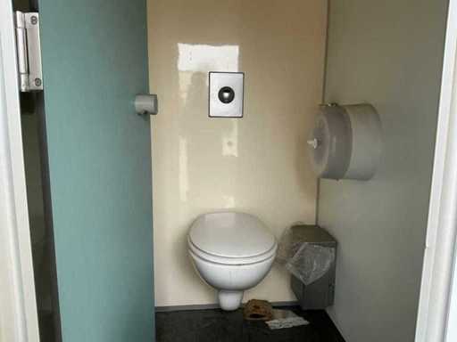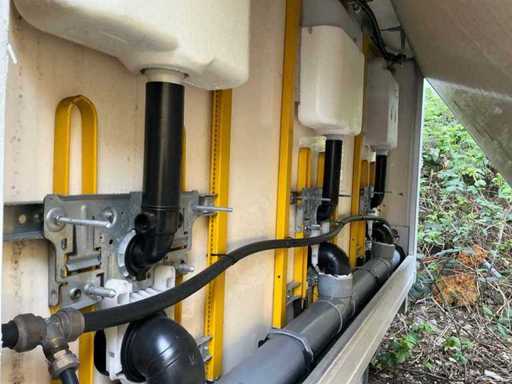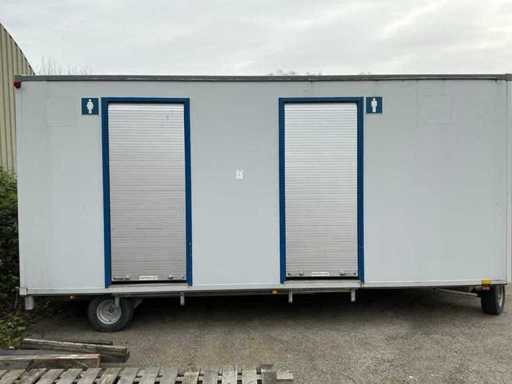 Verrijdbare sanitair unit verdeeld in 2 delen, 1 deel voorzien van 3x urinoir, 1x toilet, Wastafel met papier dispenser en automatische handendroger, Elektrisch verwarmingselement; 1 deel voorzien van 3x toilet, Wastafel met papier dispenser en automatische handendroger, Elektrisch verwarmingselement; 2x opstap, 1x reservewiel