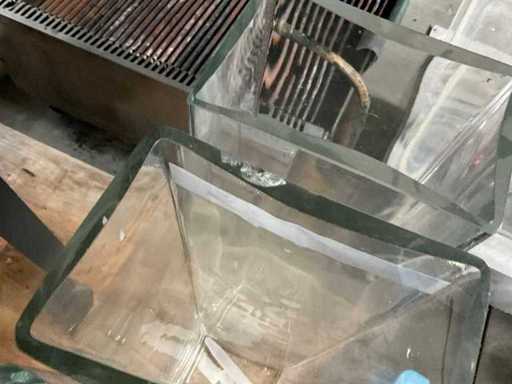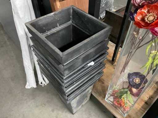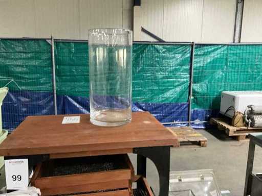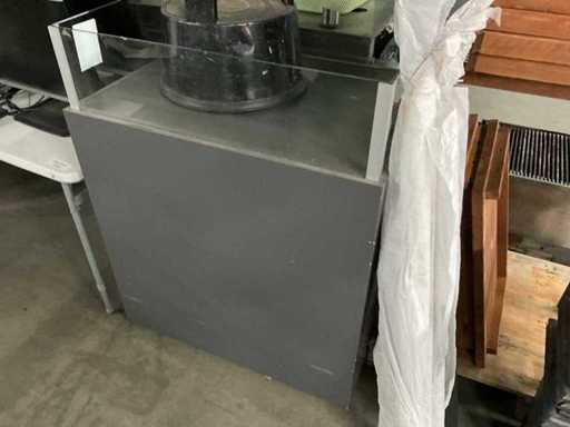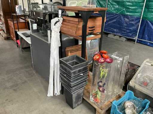 Bestaande uit verrijdbare display, ca. 80x60x102 cm, olifantpoot, kast op metalen poten, ca. 60x40x122 cm, inclusief diverse glazen vazen en metalen vierkante emmers.