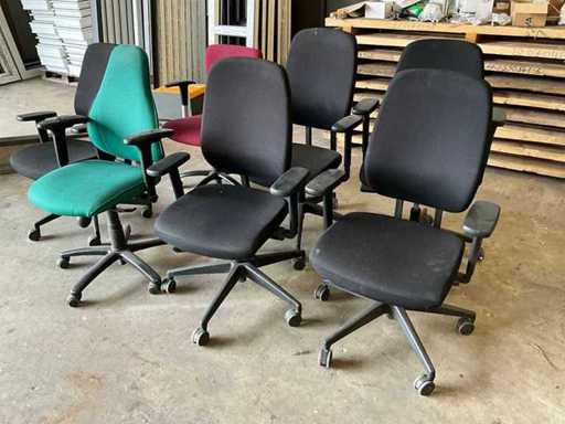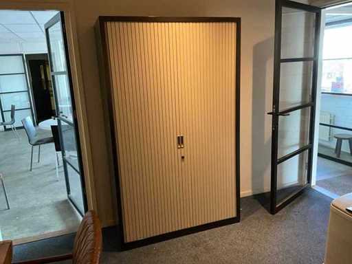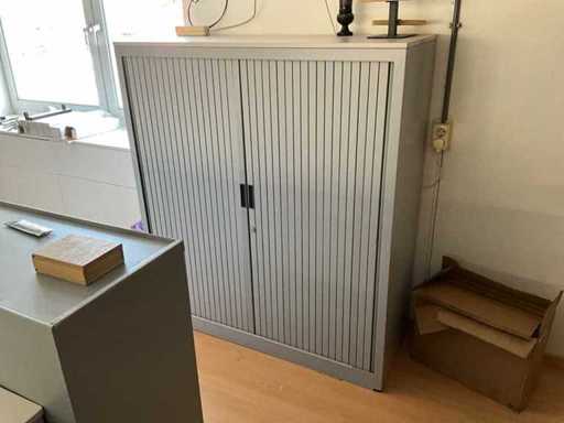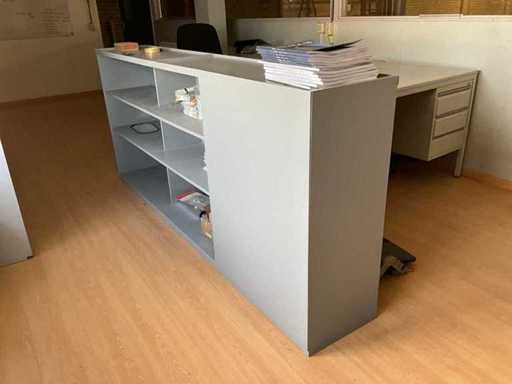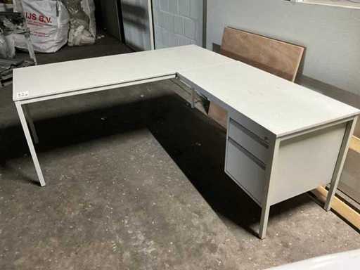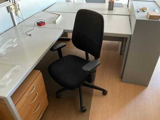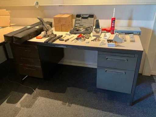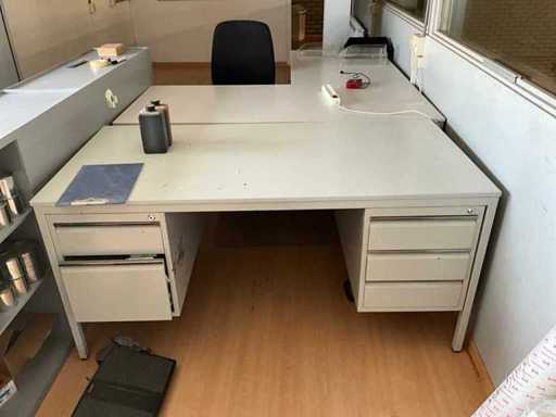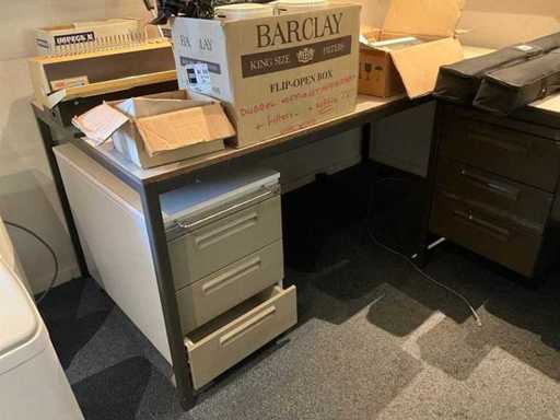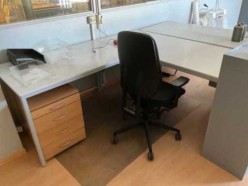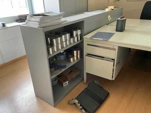 Bestaande uit: 1x bureautafel 90x180cm, 2x bureautafel met twee ladekasten 75x160cm, ladeblok, roldeurkast H195xB120xD47cm, hoekbureau, roldeurkast laag, houten wandkast, dartbord elektrisch, bureaustoelen en beslag