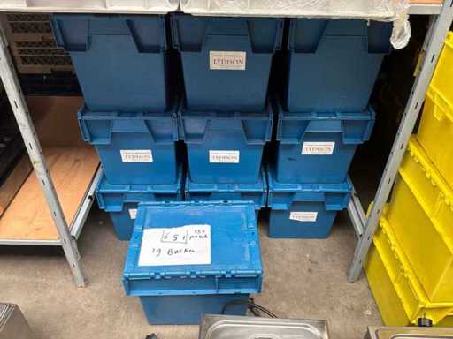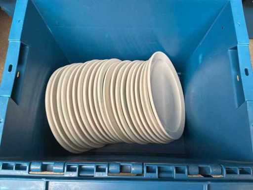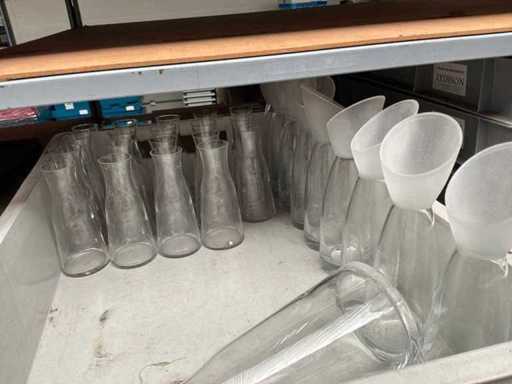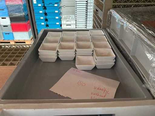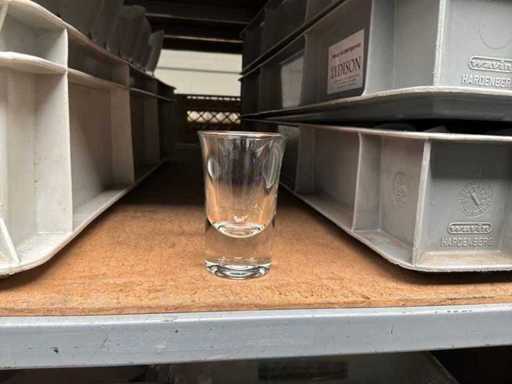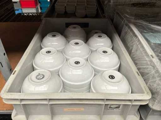 In 19 kratten/bakken w.o soepkommen, vaasjes, suikerpotjes, borden. 631x shotglas. 180x schaaltjes vierkant, suiker en roomkan 21x