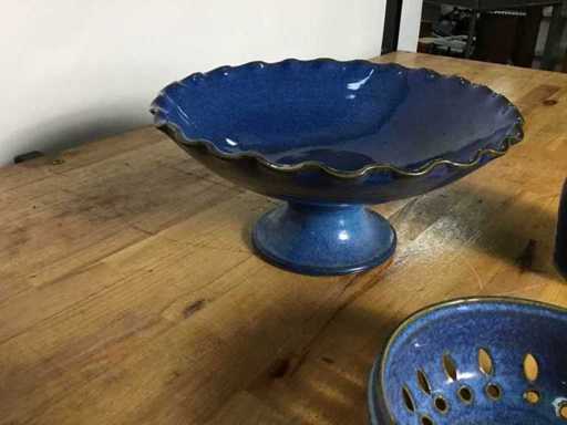 Deze set bestaat uit decoratief aardewerk, waaronder een fruitschaal op voet, een aardewerken kan en een fruitmandje/vergiet met blauw glazuur. Dit soort handgemaakte keramiek werd in Nederland veelvuldig geproduceerd door ateliers zoals die in Gouda. Handvat van de schenkkan is los