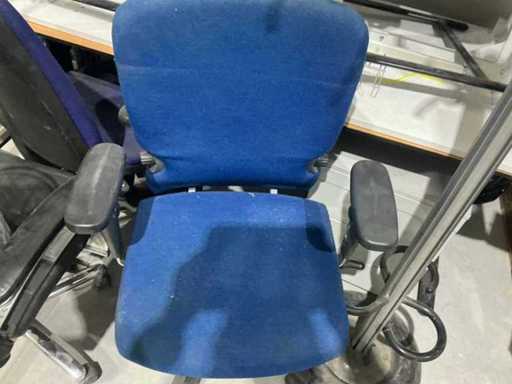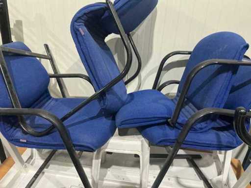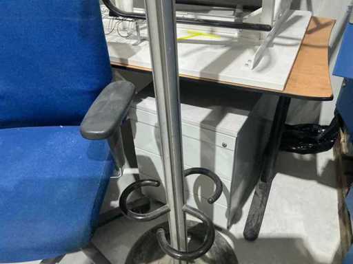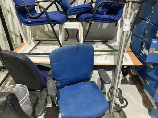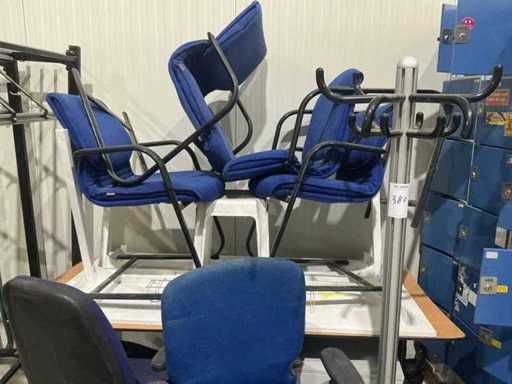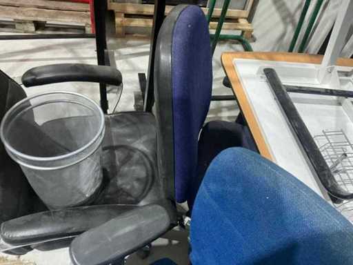 Bestaande uit 7 diverse stoelen, 2 bureautafels, 1kapstok, 1 ladenblok, 1x krukje en 2x prullenbak