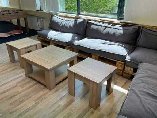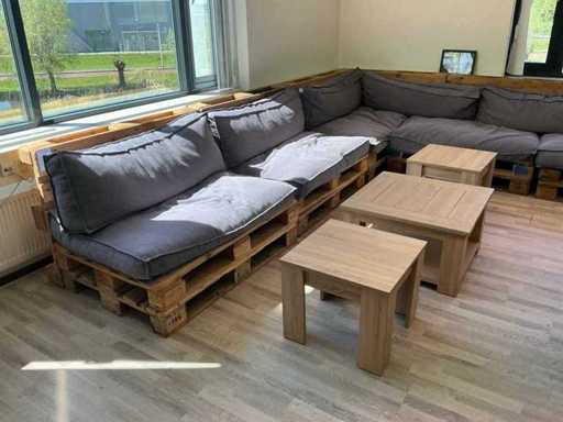 Bestaande uit L bankopstelling van pallets met kussens, en 3x tafel