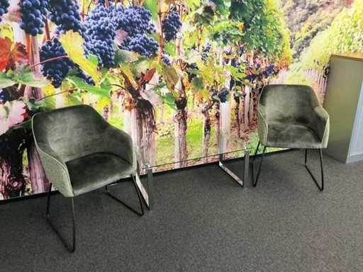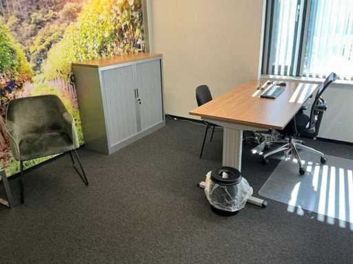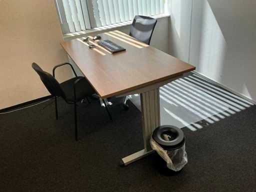 Bestaande uit inhoud kantoorruimte voorzien van onder andere: Bureau (LxBxH:800x1600:760mm), 1x bureaustoel, 2x wachtkamer stoel met tafel, kantinestoel, dossierkast, wanddoek (LxH:5000x2500mm) en whiteboard.