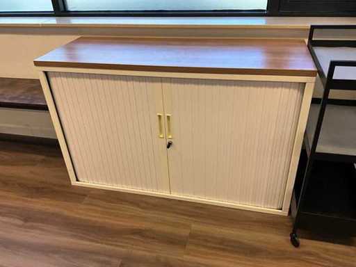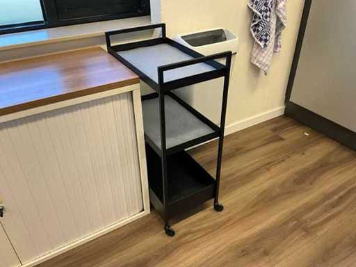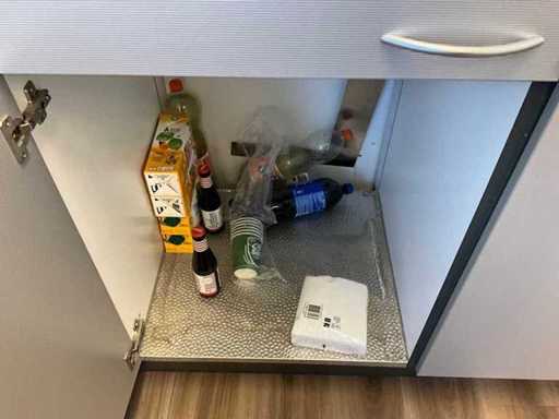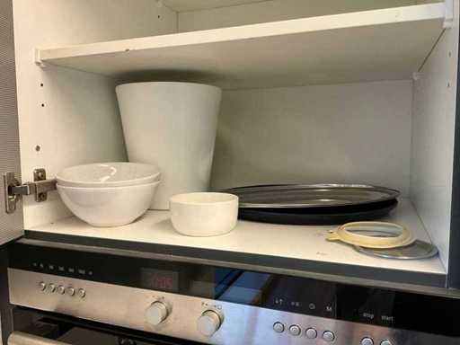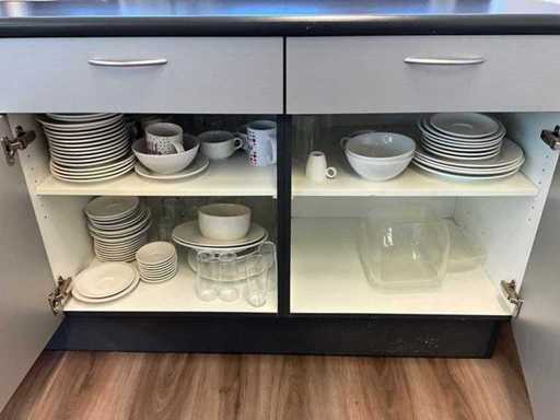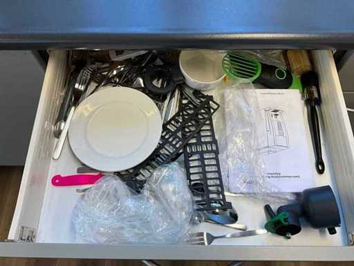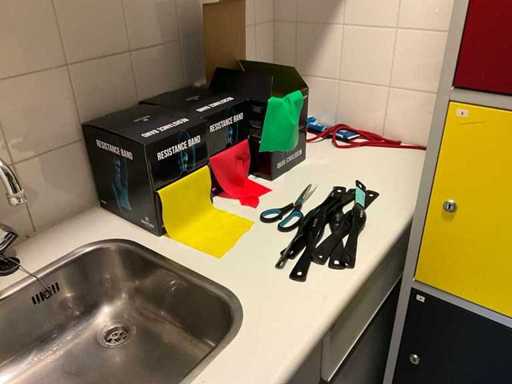 Bestaande uit onder andere: roldeurkast, H75xB120xD44cm, eetkamerstoel, bankje, trolley, thermoskannen, servies, afvalemmers, 4x lockerkast H195xB40xD45cm, verrijdbare stoel, resistance band, hartslagmeters, rollator en andere hulpmiddelen.