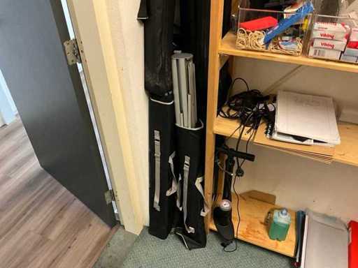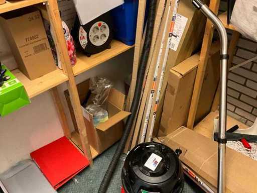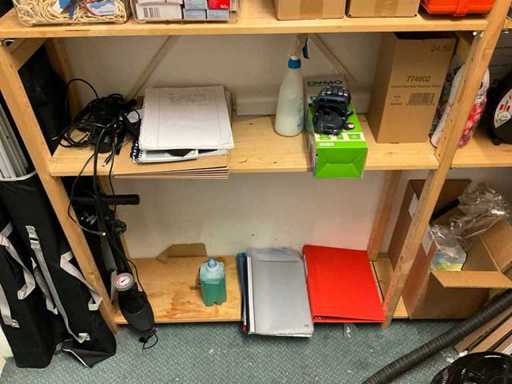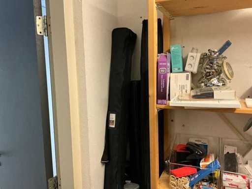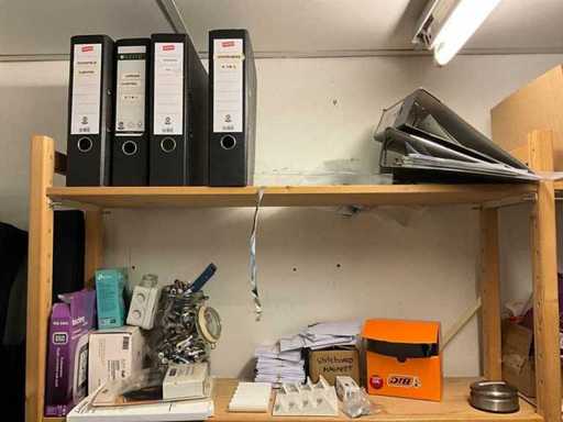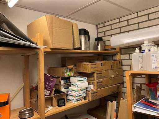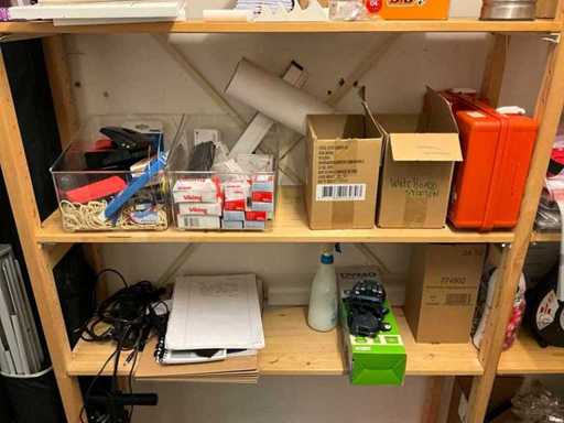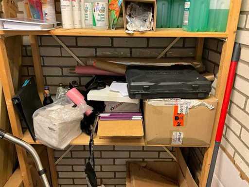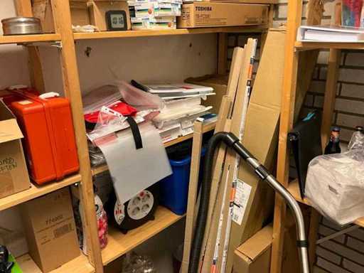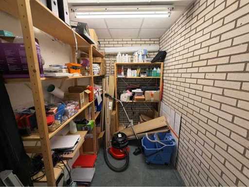 Betreft de inhoud van de ruimte; onder andere: houten Legbordstellingen, Numatic stofzuiger, kantoorgerei, banners, schoonmaakmiddelen, etc