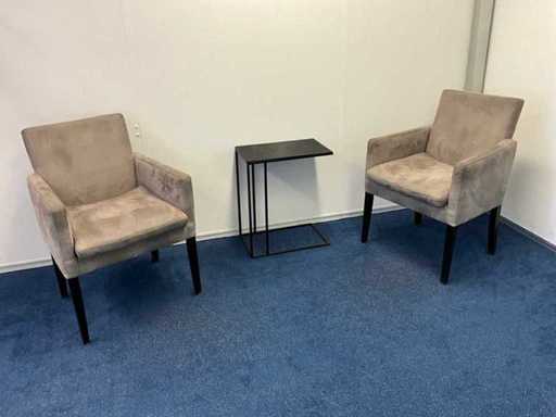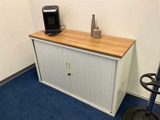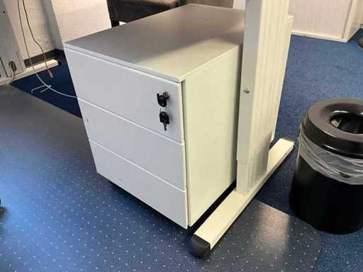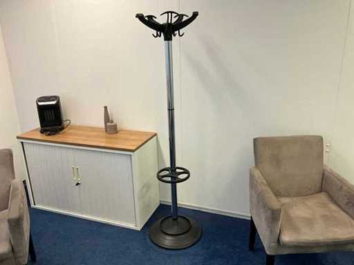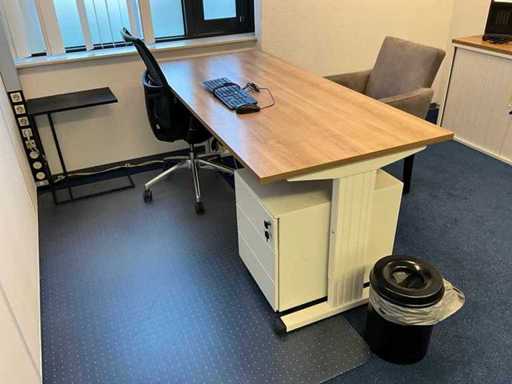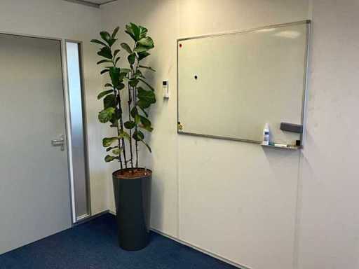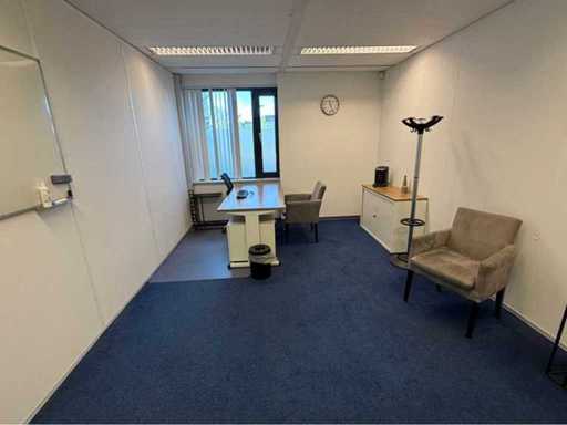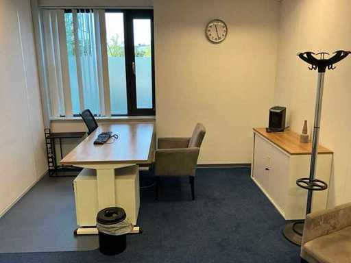 Bestaande uit inhoud kantoorruimte voorzien van onder andere: bureautafel 80x160cm in hoogte verstelbaar, ladeblok, bureaustoel, 3x De Arend eetkamerstoel, roldeurkast H75xB120xD44cm, hydrocultuurplant in pot, 2x bijzettafel, kapstok en whiteboard 90x120cm (wandgemonteerd)