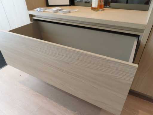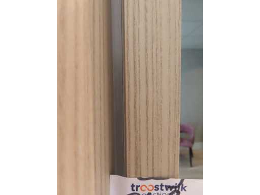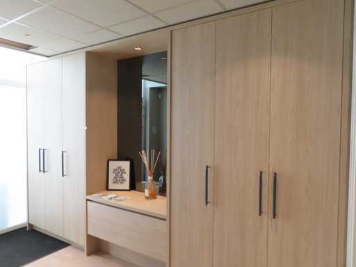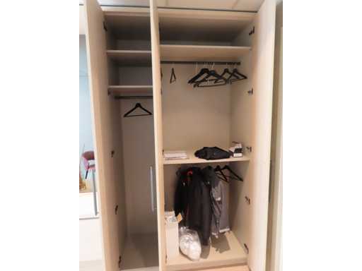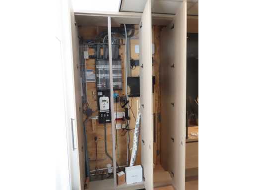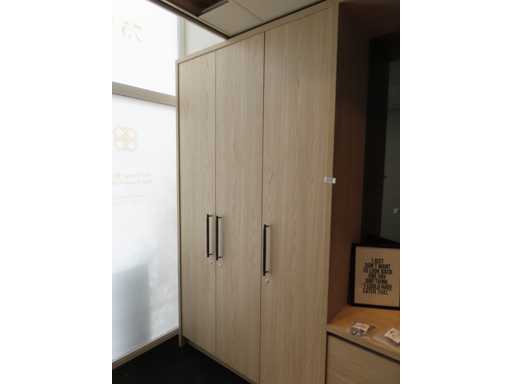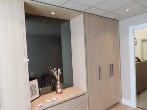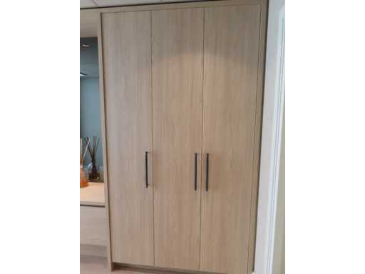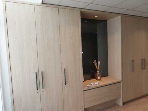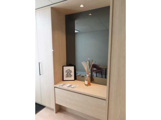 bestaande uit deels meterkast ombouw deel, ladekast opstelling met rookglas spiegel en plafondspot en kledingkast gedeelte. Essen/Eiken decor. Totaal afmeting: circa 266x427x62 cm (hxlxd). Onbekend of het in zijn geheel gedemonteerd kan worden. Zonder sleutels.