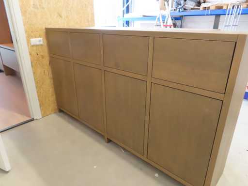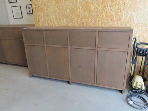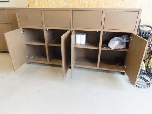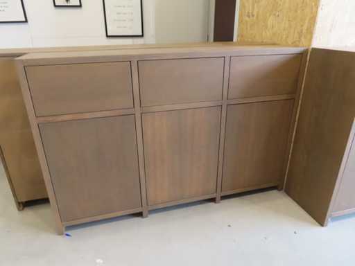 3 x wandkast, waavran 2 x 4 deurs (122x220x45 cm (hxlxd)) en 1 x 3 deurs (122x185x36 cm (hxlxd)), hoge kwaliteit dinker eikenhout fineer op MDF basis. Kasten voorzien van klapdeuren en lades met softclose.