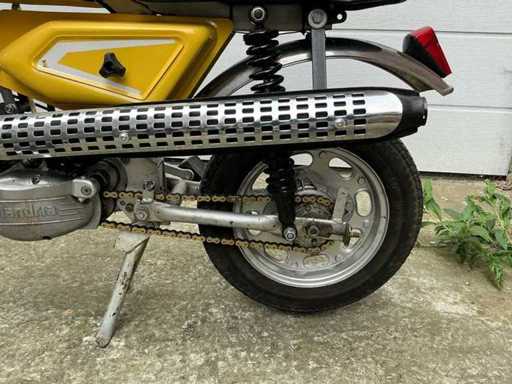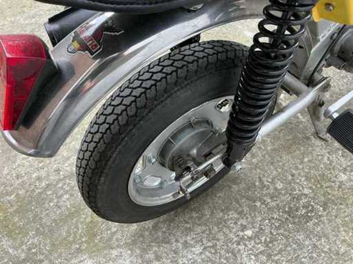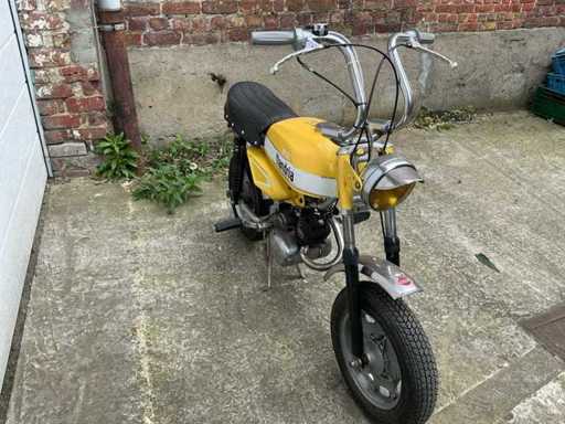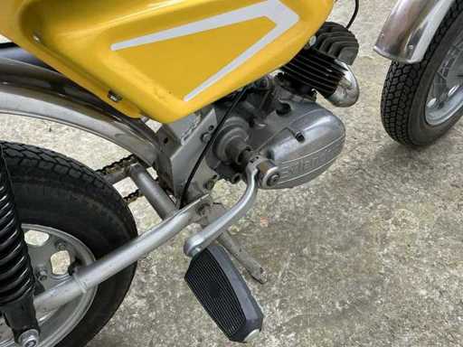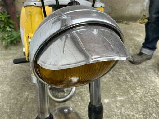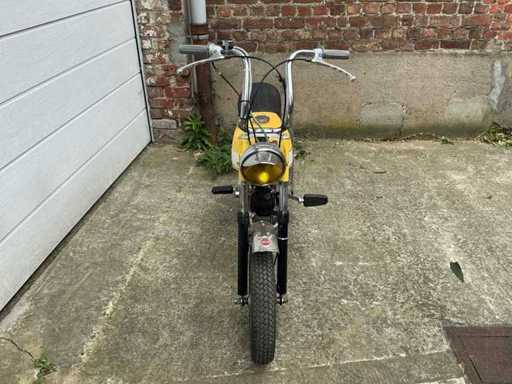 De bromfiets maakt een verzorgde en grotendeels complete indruk en is uitgerust met een eencilinder tweetaktmotor, hoog geplaatste uitlaat met geperforeerd hitteschild, kleine gegoten wielen, telescopische voorvork, dubbele achtervering en een karakteristieke koplamp met kap. De geel-witte kleurstelling geeft het geheel een frisse en herkenbare uitstraling. De lak, stickers en afwerking vertonen normale gebruiks- en ouderdomssporen. Ook zijn lichte sporen van slijtage, verwering en gebruik zichtbaar op onder meer frame, spatborden, ketting, uitlaat, velgen en diverse metalen delen.