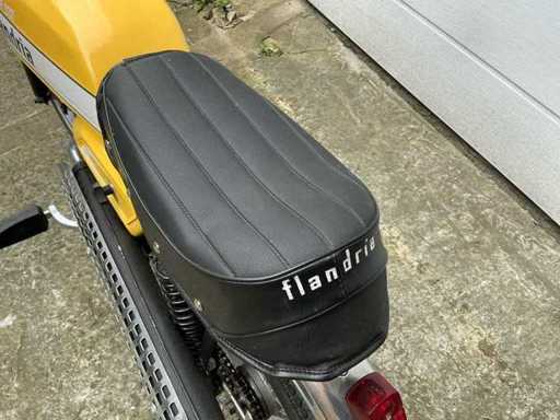 Flandria bromfiets in opvallende gele uitvoering met witte striping en zwarte buddyseat. Dit compacte en karaktervolle exemplaar presenteert zich met de typische vormgeving van de lichte Belgische bromfietsen uit de jaren zeventig. Volgens het voorgelegde attest van bouwjaar betreft het een Flandria, type SP847 AF-A, met chassisnummer 10231 en bouwjaar 1973.