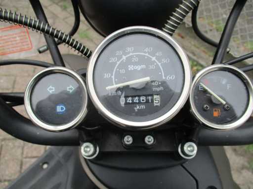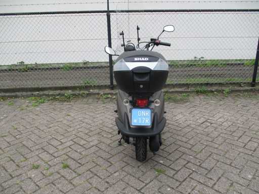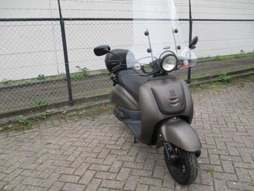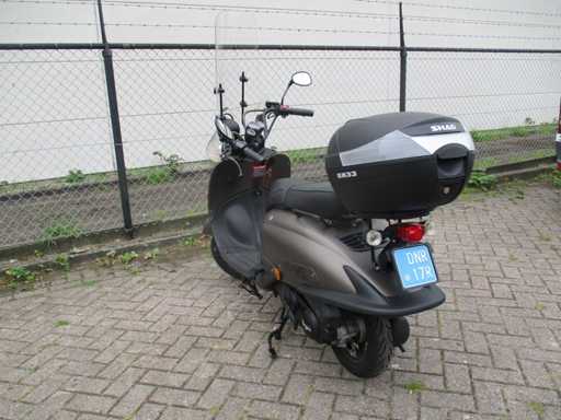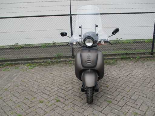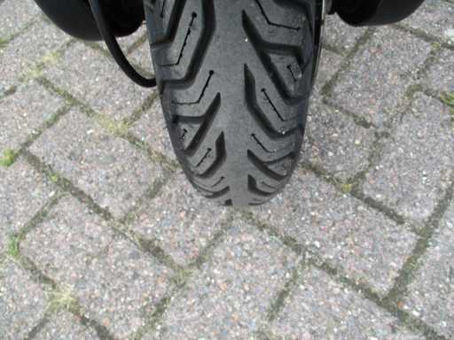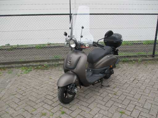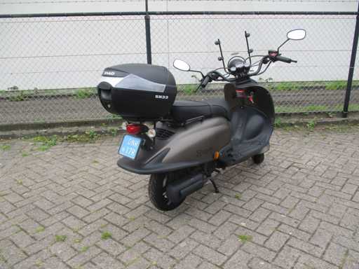 Snorscooter met 1 sleutel inclusief hoog windscherm, topkoffer (1 sleutel). Scooter in nette staat, motor loopt.