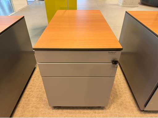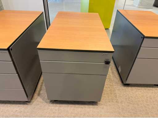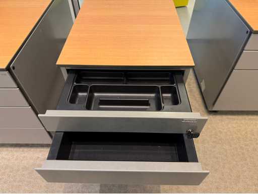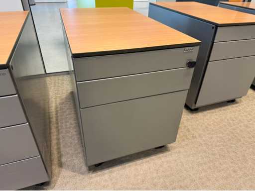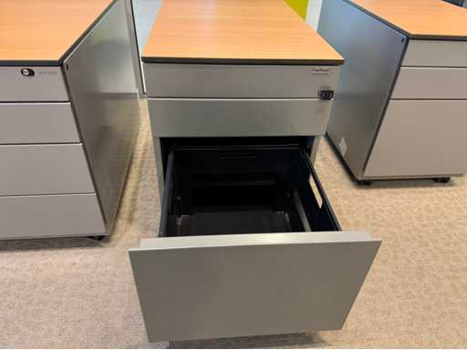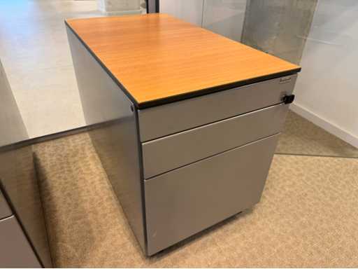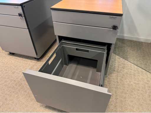 Verrijdbaar ladeblok voorzien van trespa houtnerf topblad, hangmap lade en sleutel