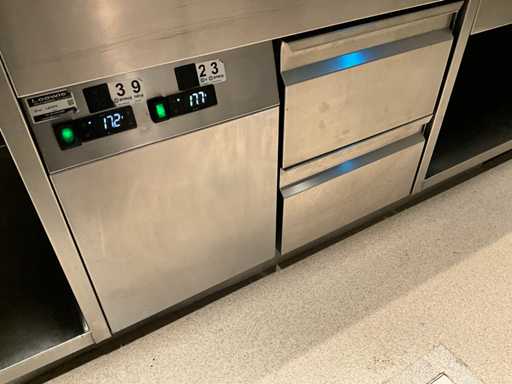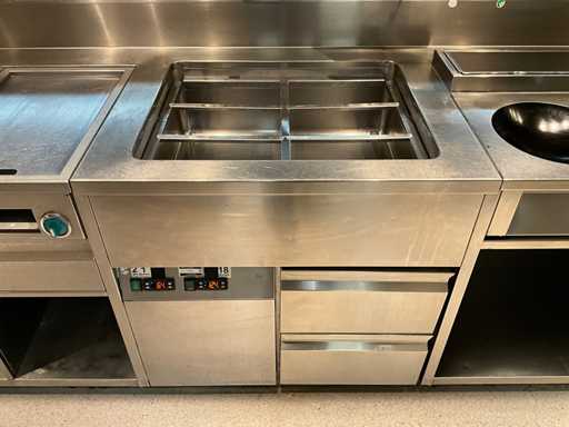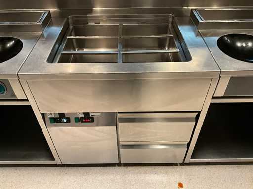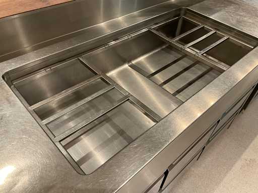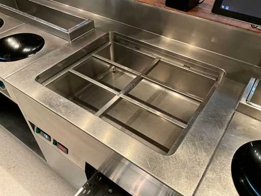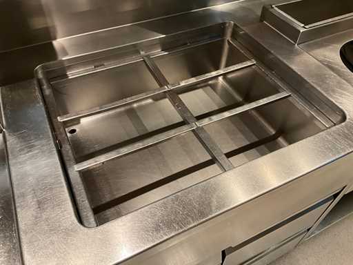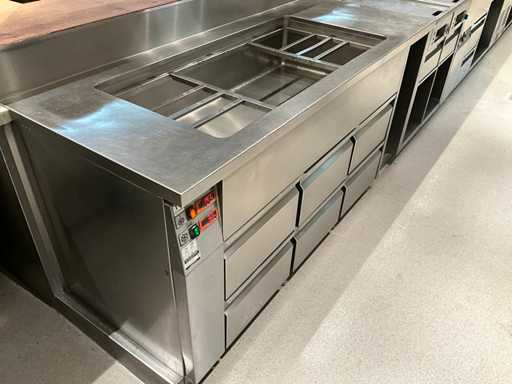 Koelwerkbanklijn met saladettes en gekoelde lades. LET OP! Pastakokers, inductiewokken en bakplaten behoren NIET tot de kavel.