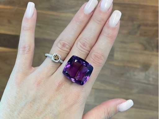 Edelsteen: Amethist; Aantal: 1 stuk; Slijpvorm: Gefacetteerd; Gewicht (carat): 50.11 carat; Kleur: Paars; Zuiverheid: Met natuurlijke insluitsels; Conditie: Nieuw; Verpakking: Edelsteendoos; Toelichting: De kwaliteit is overgenomen van het rapport behorend bij item. De waardebepaling is een beoordeling van een gecertificeerde diamantair, gebaseerd op consumentenprijzen.; Extra informatie: Edelstenen worden vaak behandeld om de kleur of helderheid te verbeteren., Dit is niet onderzocht voor dit specifieke artikel; Consumentenprijs: € 2.200,-
