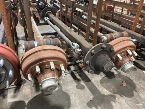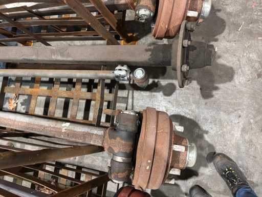 1x vaste as (breedte tussen de flens 1870 mm, 8 bouts/steek circa 270 mm), 1x stuuras (circa breedte tussen de fusees 1260 mm, remtrommel breedte 110 mm, 8 bouts/steek circa 270 mm), stuurstang