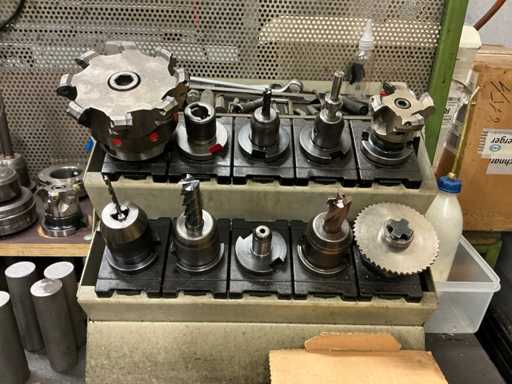 - 2 gereedschapshouderblokken gevuld met verschillende SK-bevestigingen en gebruikte freesgereedschap
