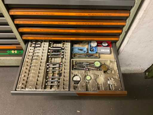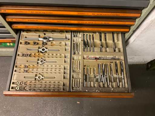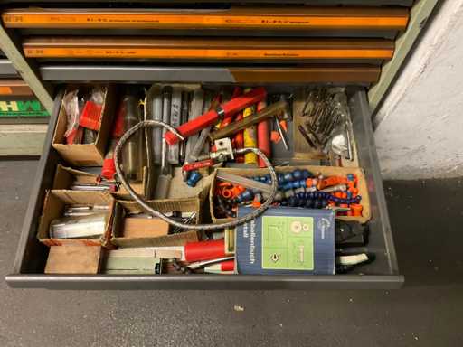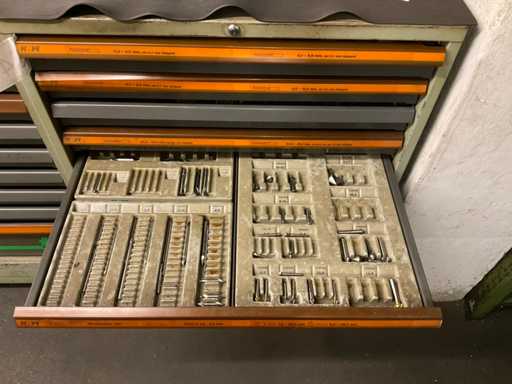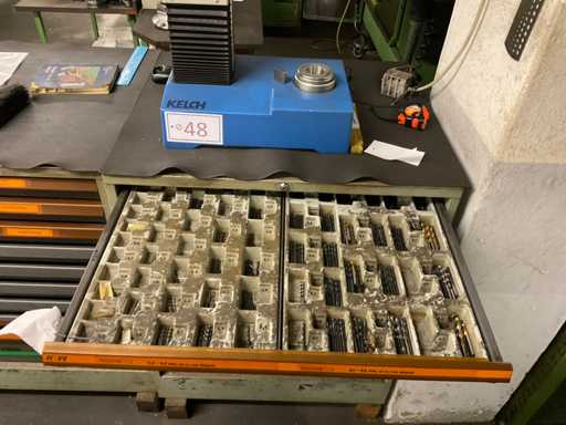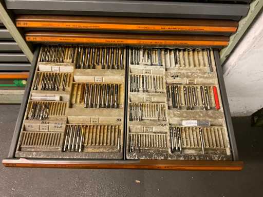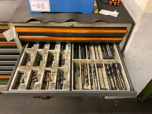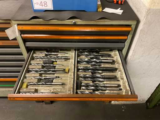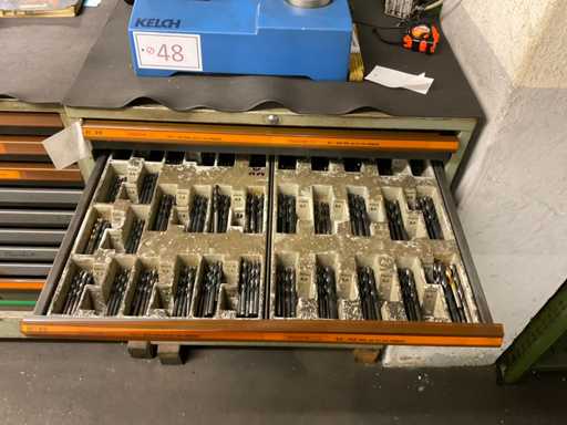 Ladekast 9-lags met inhoud, bestaande uit: bijvoorbeeld diverse HSS-twistbooringen, diverse verzinkingen, diverse NC-boorpunten, diverse machineboormachines, diverse testmandrels