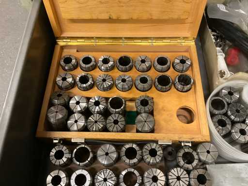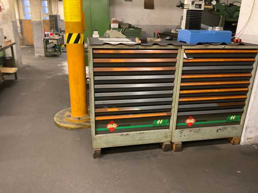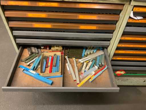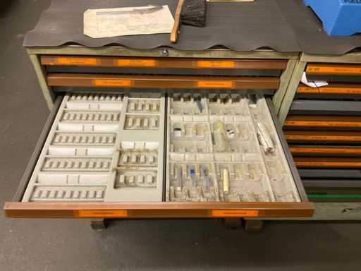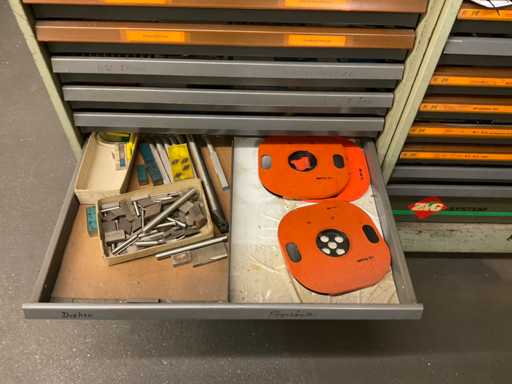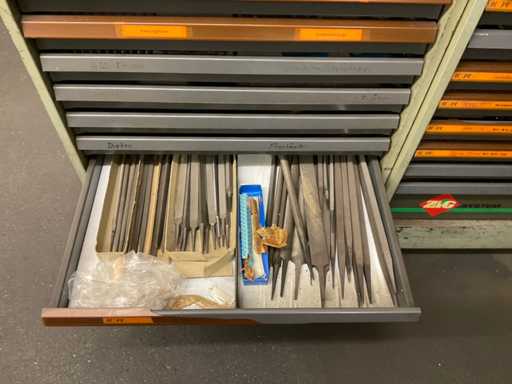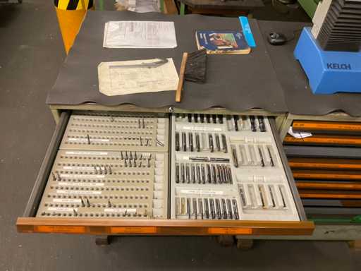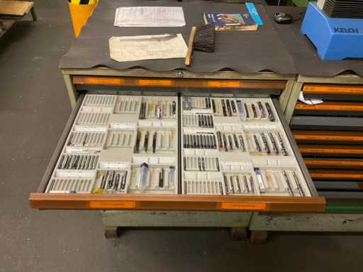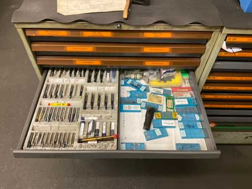 Ladekast 9-compartiment met inhoud, bestaande uit: diverse massief hardmetalen en HSS freessnijders, diverse indexeerbare inzetstukken, diverse spantangen, diverse stalen vijlen