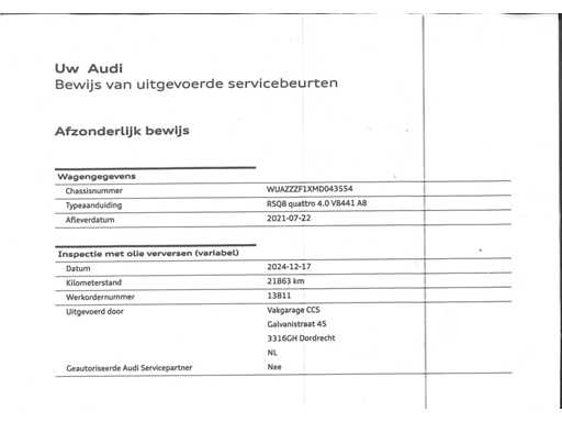 4-Wiel besturing, 4x4 Vierwielaandrijving (Quattro), 360°Camera, achterasbesturing, achterbank verstelbaar, adaptief demping systeem, airco separaat achter, Alarm klasse 5 (voertuigvolgsysteem), Alcantara dakhemel, Alcantara stuurwiel, Anti Blokkeer Systeem, Apple Carplay/Android Auto, armsteun achter, armsteun voor, audio installatie high end, audio installatie premium, Autonomous Emergency Braking, bagage-scheidingsnet, bandenspanningscontrolesysteem, Bang & Olufsen Audio, bestuurdersairbag, binnenspiegel automatisch dimmend, Bluetooth telefoonvoorbereiding, bots herkenning en activatie, bots waarschuwing systeem, buitenspiegel(s) automatisch dimmend, buitenspiegels elektr. met geheugen, buitenspiegels elektrisch inklapbaar, buitenspiegels elektrisch verstel- en verwarmbaar, bumpers in carrosseriekleur, carbonafwerking interieur, carbon exterieur delen, centrale deurvergrendeling met afstandsbediening, connected services, cruise control, DAB ontvanger, dakrails, dimlichten automatisch, draadloze telefoonlader, Dynamische knipperlichten, electronic climate controle, elektrisch bedienbare achterklep, elektrische ramen voor en achter, elektrisch glazen panorama-dak, Elektrisch verstelbare bestuurdersstoel met geheugen, Elektrisch verstelbare passagiersstoel met geheugen, elektrisch verstelbare stoel(en) met geheugen, elektrisch verstelbare stuurkolom, Elektrisch verstelbare voorstoelen, Elektronisch Stabiliteits Programma, extra getint glas, Glascoating, grootlichtassistent, head-up display, hill hold functie, hoofd airbag(s) achter, hoofd airbag(s) voor, Keyless Go & Entry, koplampen adaptief, koplampreiniging, Lane Assist, LED achterlichten, LED dagrijverlichting, Leder, lederen interieurdelen, lendesteunen (verstelbaar), lichtmetalen velgen 5-spaaks 23", luchtvering en automatische niveauregeling, luxe lederen bekleding, matrix LED koplampen, Memorystoelen, metaalkleur, multimedia-voorbereiding, navigatiesysteem full map, Oplopende knipperlichten voor en achter, Parkeerassistent, parkeersensor achter, parkeersensor voor, passagiersairbag, regensensor, rijstrooksensor, Rondomzichtcamera, ruitensproeiers verwarmbaar, schakelmogelijkheid aan stuurwiel, Sfeerverlichting, sluitbekrachtiging, Softclose, Sportstoelen, Sportstuur, sportuitlaat, Spraakbediening, start/stop systeem, stoel ventilatie voor, Stoelverwarming voor, stuurbekrachtiging, stuur verstelbaar, stuurwiel multifunctioneel, telefoonintegratie, trekhaak elektrisch uitklapbaar, Verlengde Fabrieksgarantie, Virtual Cockpit, volledig digitaal instrumentenpaneel, Volledige dealeronderhoudshistorie beschikbaar, warmtewerend glas, WiFi voorbereiding, WUAZZZF1XMD043554, zij airbag(s) voor, Zonneschermen achter en Zwart dakhemel